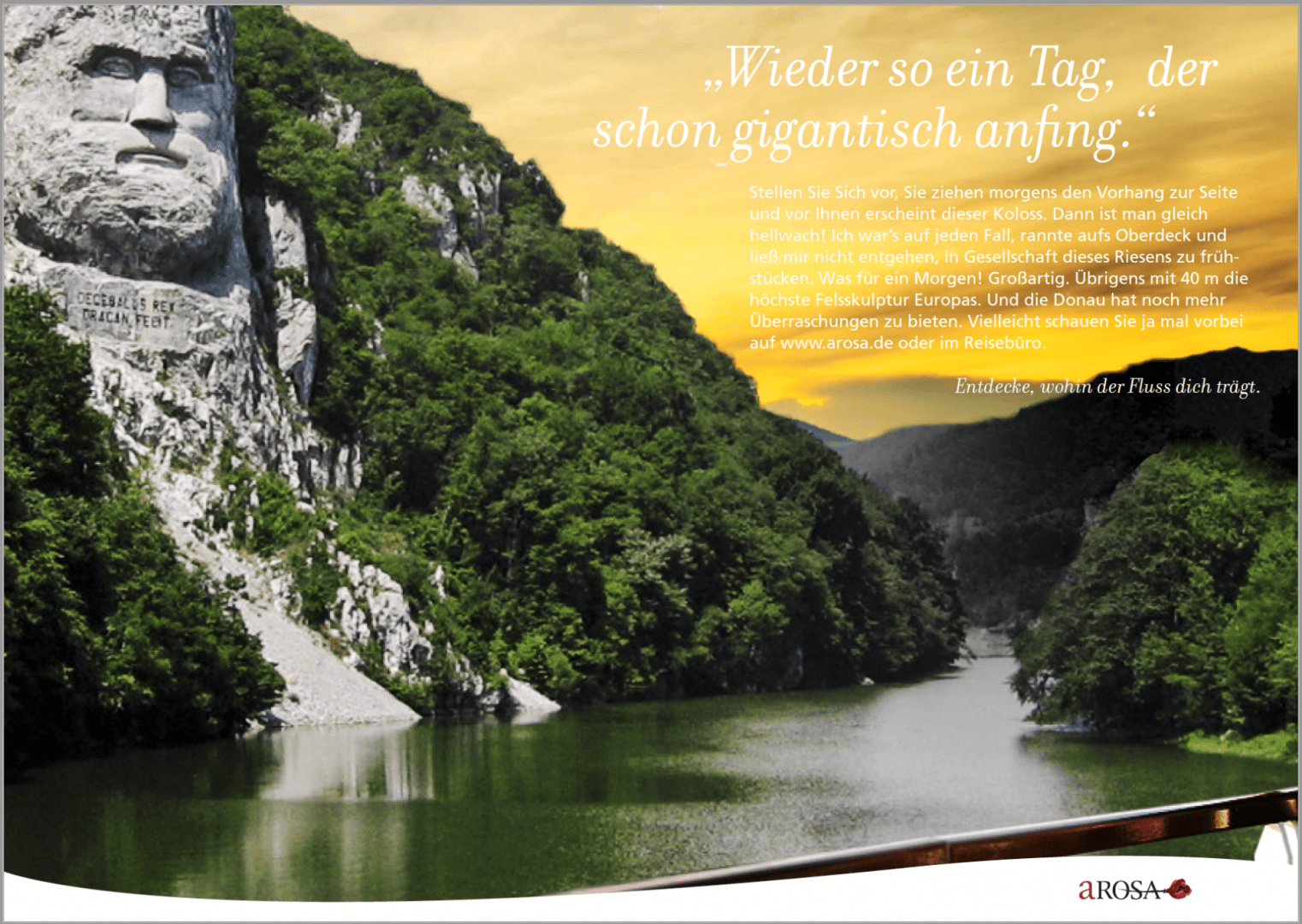Und das entdecken wir zusammen mit Yvonne Catterfeld – immer über ihre Schulter hinweg. Dabei erzählt sie im Stil eines Reisetagebuchs, was sie erlebt hat. Die Anzeigen sind gleichzeitig die Kapitel im Katalog. Aus Zeitgründen wurde dieses schöne Konzept leider nicht umgesetzt.
