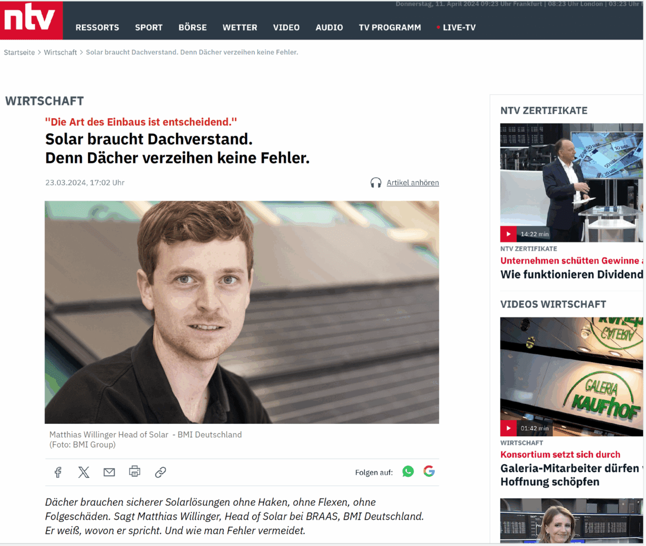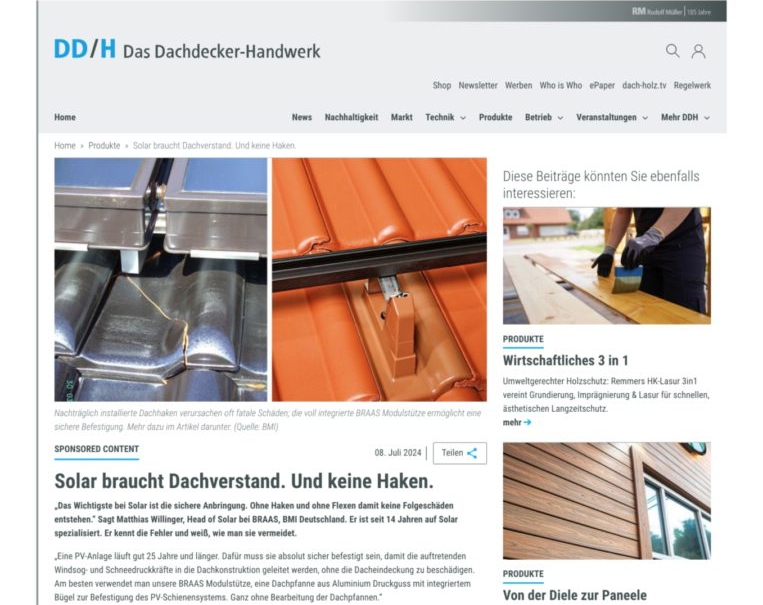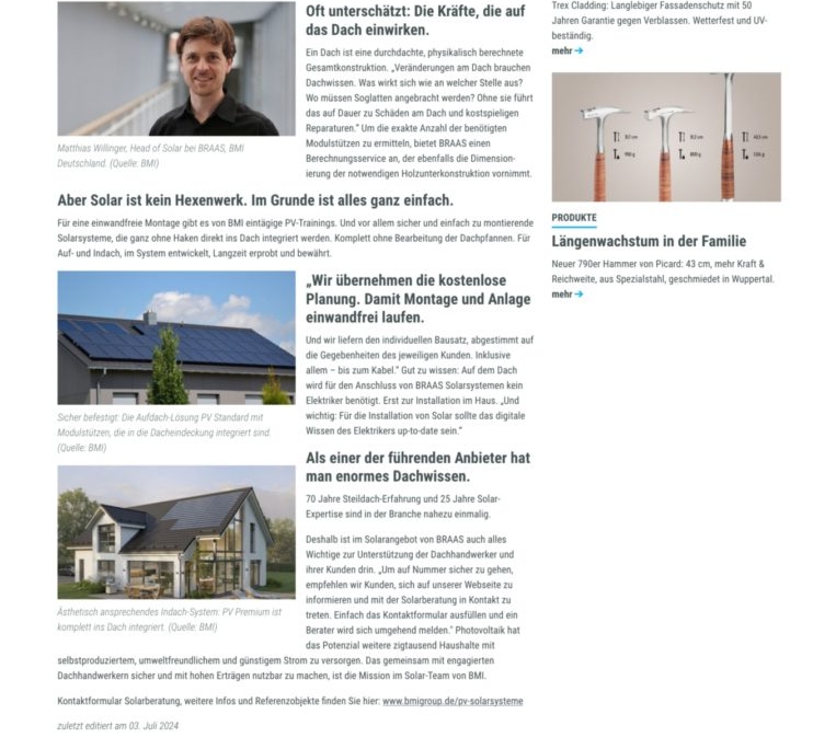 Der Solarmarkt wird überflutet von Billig-Angeboten und nicht einschätzbaren Produkten. Unter dem Motto „Solar braucht Dachverstand“ liefert BMI BRAAS, der Marktführer für Steildachsysteme, hilfreiches Wissen, erprobte Produkte und Solartrainings für Verleger.